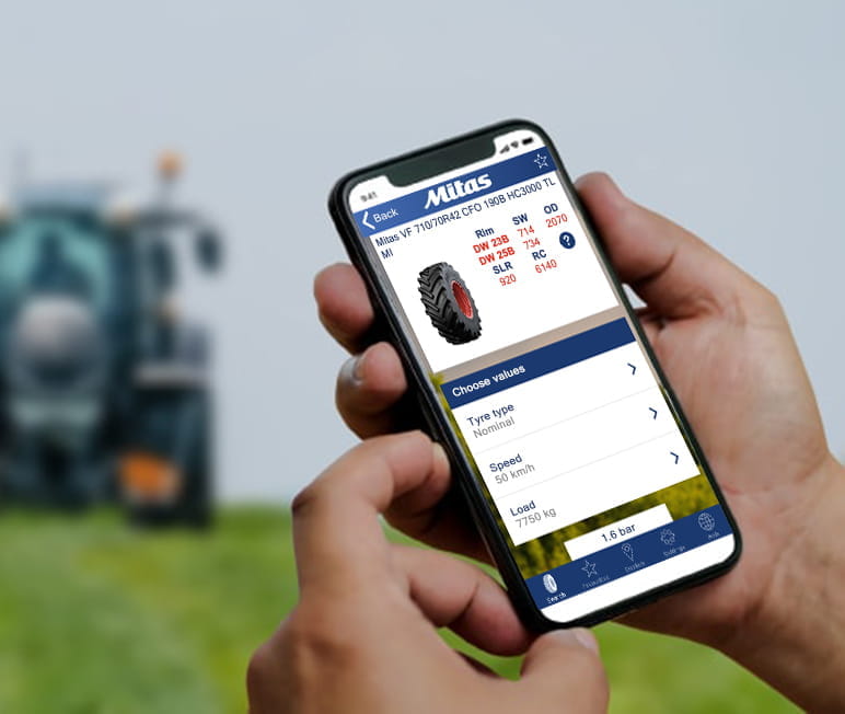 L’interface conviviale de l’application conçue par Mitas permet aux agriculteurs de choisir rapidement leurs pneus dans une liste reprenant toutes les dimensions et sculptures disponibles de la marque. La recherche textuelle par paramètre peut également être utilisée. La vitesse peut être définie en kilomètres ou en miles par heure et le poids de la cargaison (charge par pneu), en kilogrammes ou en livres. En outre, la pression des pneus proposée est affichée en BAR ou en PSI.